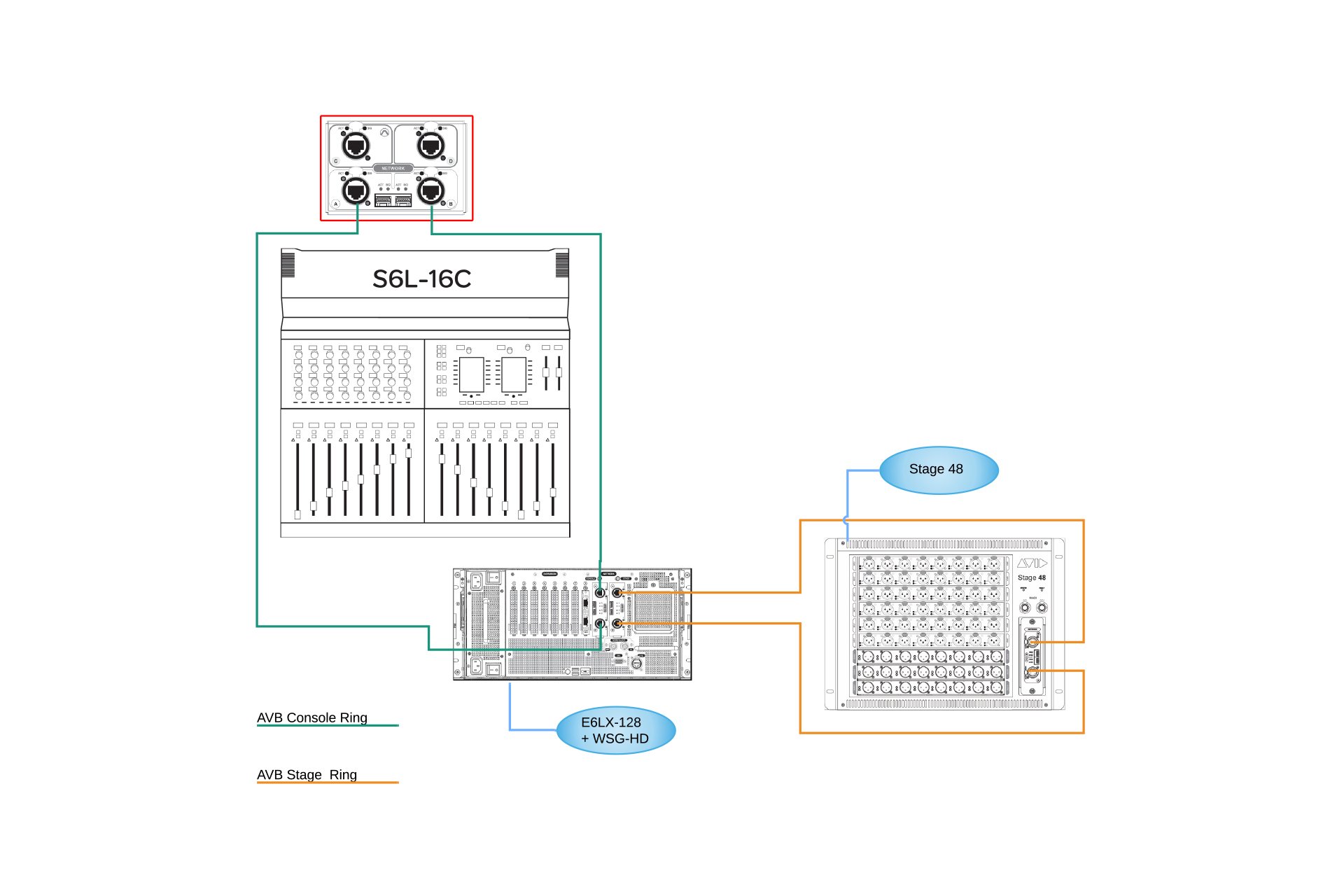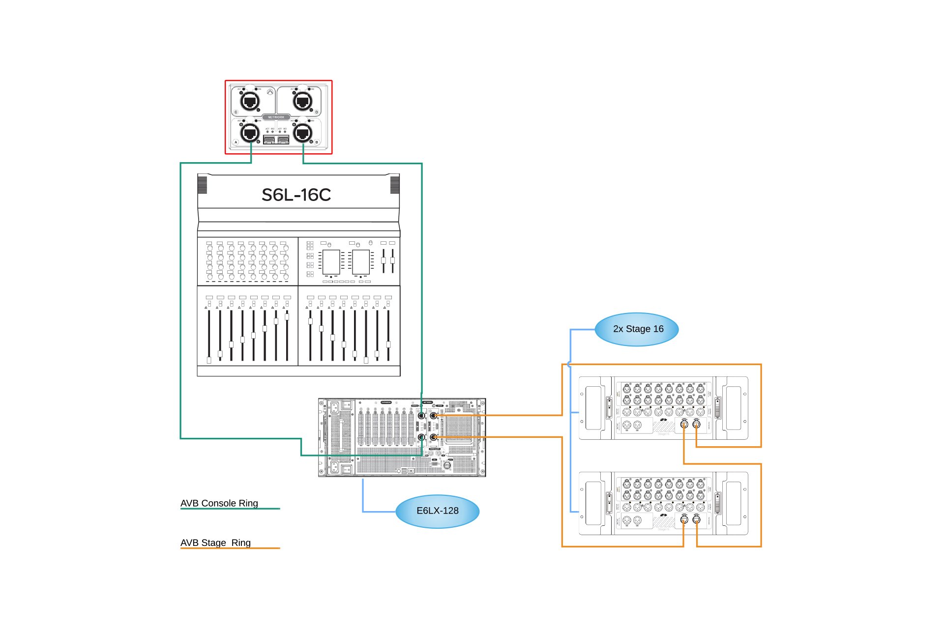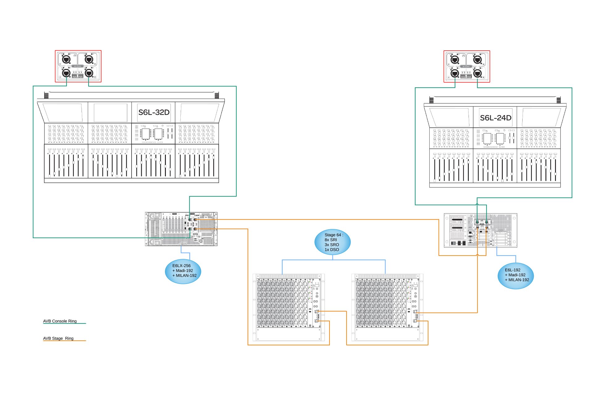 Les systèmes live Avid VENUE | S6L reposent sur une connectivité réseau AVB, via votre choix d’infrastructure CAT-5 ou Fibre Channel. Les topologies en anneau et en étoile sont prises en charge. Les deux offrent une redondance, et les réseaux en étoile sont particulièrement appréciés dans les applications de sonorisation fixe, car ils simplifient le repositionnement des consoles et des racks.