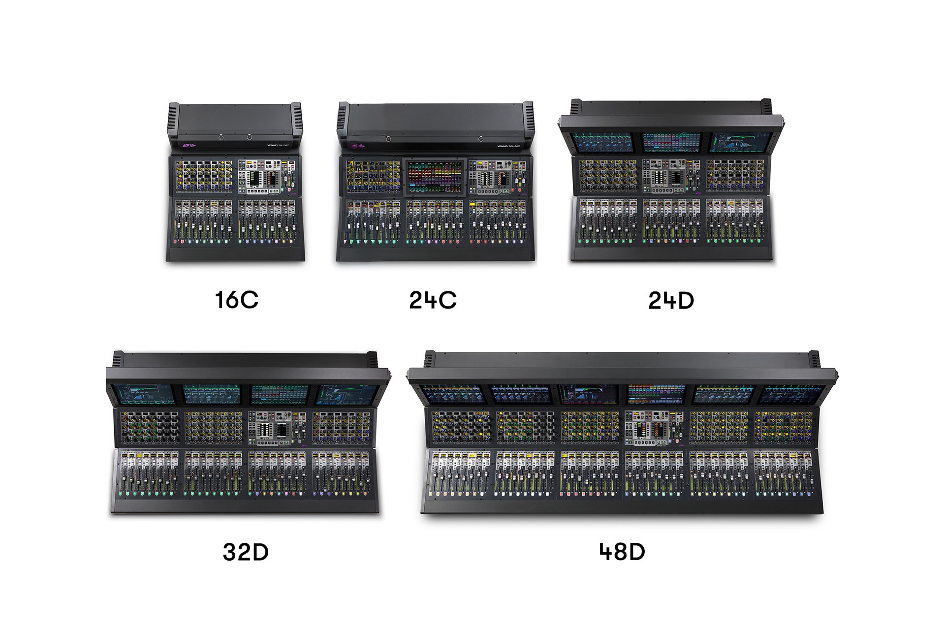 S6L propose des configurations de consoles avec 16, 24, 32 ou 48 faders, chacune conçue avec une largeur d’un pied par bloc de huit faders. Les surfaces de 32 et 48 faders sont équipées de ponts d’affichage tactile intégrés, incluant un écran tactile principal. Le modèle à 24 faders est disponible en deux versions : l’option ‘C’ comprend un seul écran tactile principal, tandis que la variante ‘D’ ajoute deux écrans supplémentaires et une banque d’encodeurs supplémentaire.