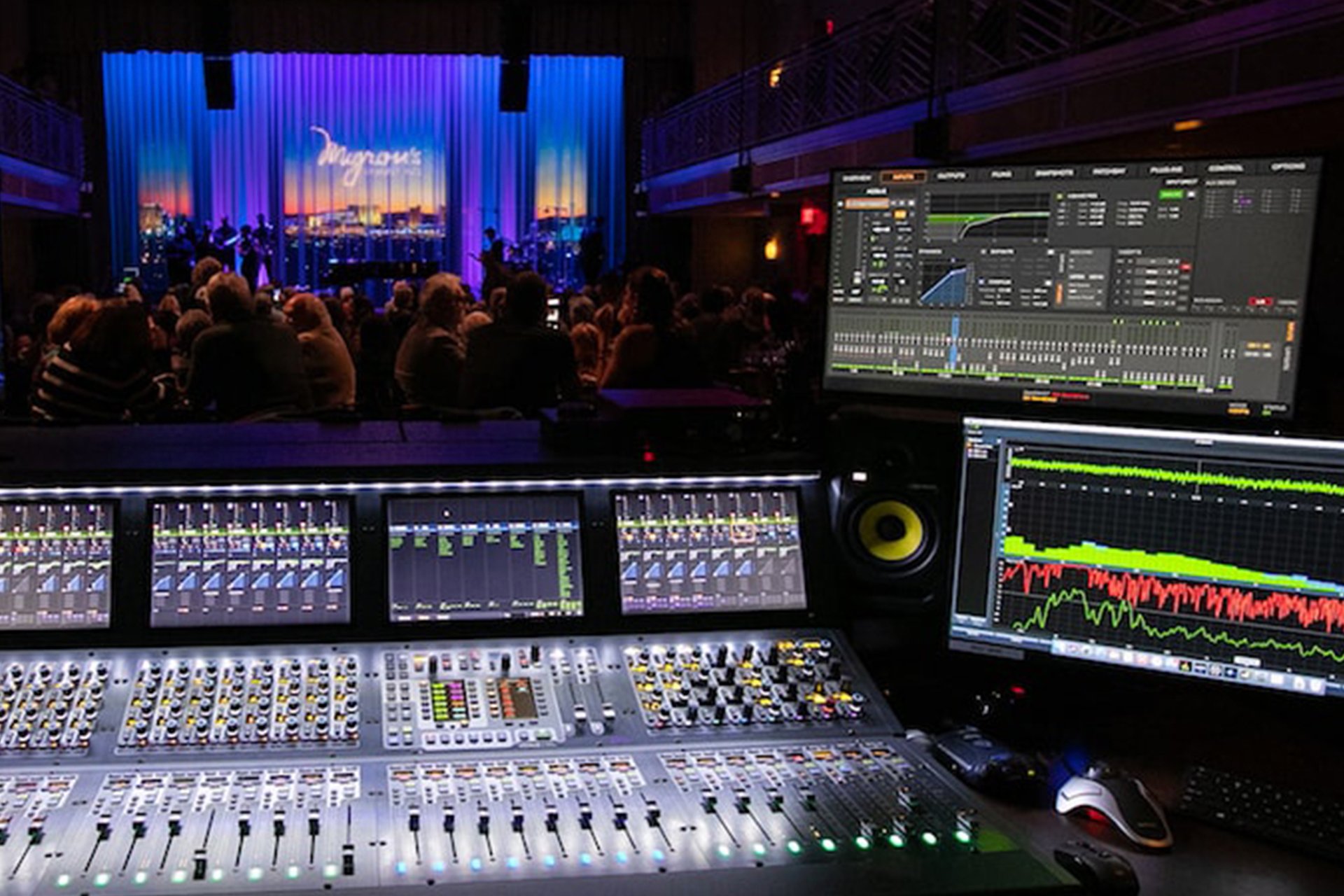 Les grandes salles accueillent généralement des groupes en tournée professionnelle, des orchestres et des productions complètes. Au-delà de l’augmentation de la capacité en canaux, il existe une attente en matière de qualité sonore et d’effets de niveau studio, ce qui nécessite une puissance de traitement suffisante pour les plugins ainsi qu’une intégration Waves. Une console de monitoring dédiée est également indispensable ici. Les fonctions de lecture et d’enregistrement sont fortement recommandées, et la sonorisation immersive doit également être envisagée.