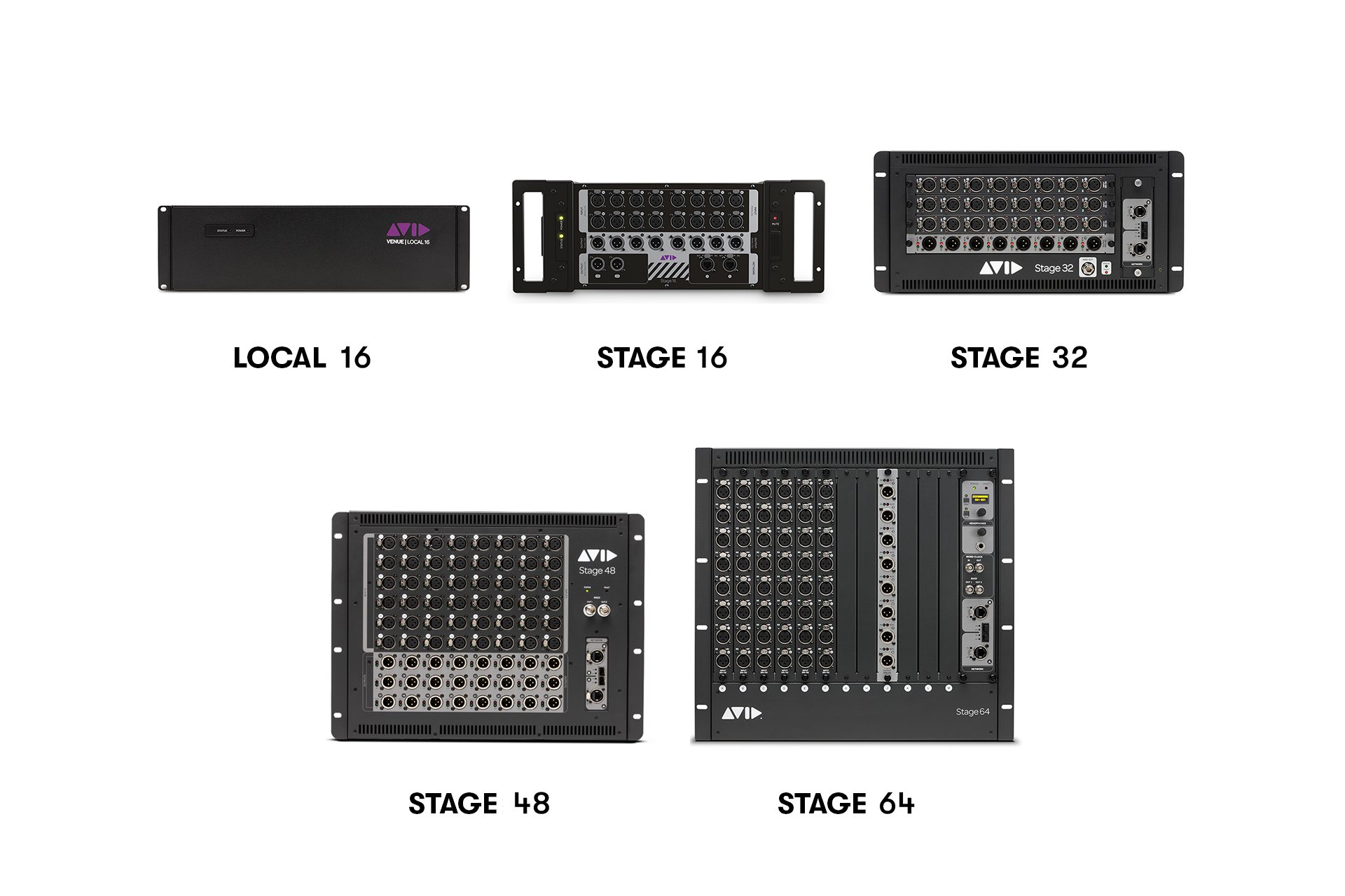 Cinq châssis d’I/O sont proposés pour configurer la connectivité. Les Stage Racks sont disponibles en versions 16, 32, 48 et 64 canaux, complétés par un module d’extension de 16 canaux pour l’intégration d’équipements au niveau des positions de mixage.